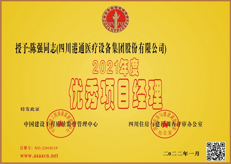 授予: 邓仕翟等八位同志(四川港通医疗设备集团股份有限公司)荣获“2021年度优秀项目经理”荣誉称号。